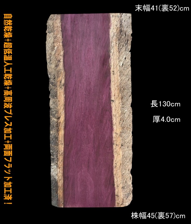 ◆全国都道府県 送料無料◆ パープルハート 無垢 一枚板 寸法:長130cm× 末幅41cm(裏52cm) ~ 株幅45cm(裏57cm) × 厚4.0cm 約16kg この板の良い所 色と木目の綺麗なパープル! 少し細目なので、ベンチやTVボードに如何でしょうか? もうパープルも輸入規制で終わりかな・・・寂しね~ この板のちょっと悪い所 耳割れ・・・ ワイヤーの掛け跡がクッキリ! 耳にピンもあるので補修してね。 ☆出荷前に再度両面最終仕上げのフラット加工後、梱包出荷いたします ☆ 厚みも2mm~5mm程度削るため薄くなることなどはご了承下さい。 (フラット加工が不要は方はご指示下さい。) ◎北海道、沖縄県を含むすべての都道府県で送料無料です。 但し離島の場合や、配送業者の規定により送料が別途必要となる場合があります。 ※離島の場合、輸送のサイズ規制によりカットの必要がある場合がございますので、ご購入の前にお問合せ下さい。 ・法人屋号や、個人様でも〇〇商店や〇〇ショップなど、屋号のある場合はお知らせください。(看板や店名が分かる表示をお願いします。) ・送料無料の範囲はすべて軒先降ろしまたは配送車両横付付近の敷地10歩以内迄となります。 ・室内への開梱設置が必要な場合はオプションで別途費用が必要となりますのでお問合せ下さい。 ・弊社より発送後、お客様地域の配送業者の規定によりご自宅まで配送ができない場合があります。 その場合は最寄りの営業所止めとなります。もしくはご希望の住所への配送の場合は別途費用が発生します。