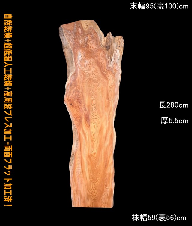 ◆全国都道府県 営業所止送料無料◆ 欅 無垢 一枚板 寸法:長280cm× 末幅95cm(裏100cm) ~中間幅81cm(裏78cm) ~ 株幅59cm(裏56cm)× 厚5.5cm 約80kg この板の良い所 形、耳、大きめのリボン杢、綺麗ですね~ 惚れ惚れしちゃういい感じの板です。 このリボンだと磨いて塗装すれば凄いぞ~ 本当カッコいい板だ。。 この板のちょっと悪い所 ちょい肌割れありますが補修してね。。 ☆出荷前に再度両面最終仕上げのフラット加工後、梱包出荷いたします ☆ 厚みも2mm~5mm程度削るため薄くなることなどはご了承下さい。 (フラット加工が不要は方はご指示下さい。) ◎長尺のため配送業者へ確認させて頂きます。 ・配送業者の規定により基本、最寄りの営業所止めになります。 ・4t車の搬入が可能で法人屋号や個人様の商店やショップで荷降ろし設備等がある場合はご指定の住所への配送が可能な場合がございます。配送業者へ確認させて頂きます。 ・法人屋号や、個人様でも〇〇商店や〇〇ショップなど、屋号のある場合はお知らせください。(看板や店名が分かる表示をお願いします。) ・チャーター便をご希望の場合は別途送料となります、お見積りさせて頂きますのでお問合せ下さい。