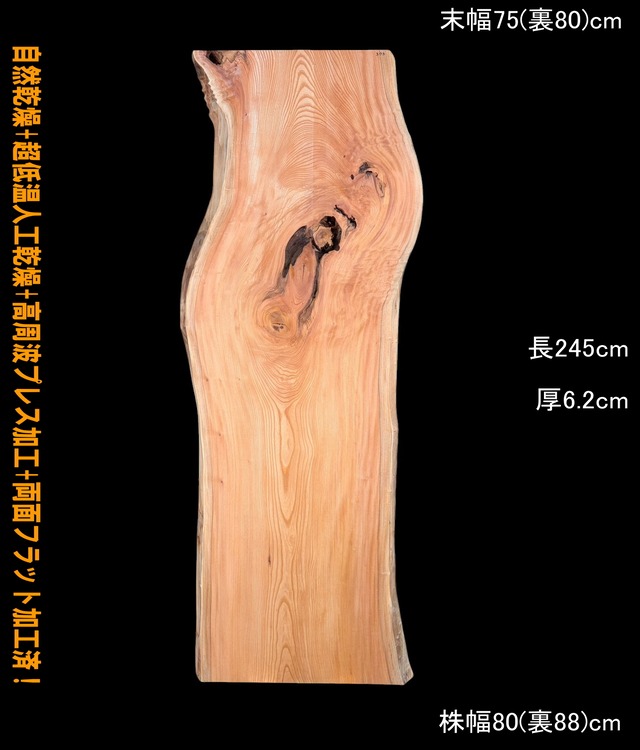 ◆全国都道府県 送料無料◆ 楠 無垢 一枚板 寸法:長245cm× 末幅72cm(裏84cm) ~ 中間幅66cm(裏74cm) ~ 株幅96cm(裏97cm)× 厚5.9cm 約66kg この板の良い所 形のカッコいい楠! 裏も表も綺麗なので、お好きな方を使って下さい。 しっかりした赤身で力強くてカッコいですね。 この板のちょっと悪い所 少し肌割れありますが問題無いね。。 ☆出荷前に再度両面最終仕上げのフラット加工後、梱包出荷いたします ☆ 厚みも2mm~5mm程度削るため薄くなることなどはご了承下さい。 (フラット加工が不要は方はご指示下さい。) ◎北海道、沖縄県を含むすべての都道府県で送料無料です。 但し離島の場合や、配送業者の規定により送料が別途必要となる場合があります。 ・法人屋号や、個人様でも〇〇商店や〇〇ショップなど、屋号のある場合はお知らせください。(看板や店名が分かる表示をお願いします。) ・送料無料の範囲はすべて軒先降ろしまたは配送車両横付付近の敷地10歩以内迄となります。 ・室内への開梱設置が必要な場合はオプションで別途費用が必要となりますのでお問合せ下さい。 ・弊社より発送後、お客様地域の配送業者の規定によりご自宅まで配送ができない場合があります。 その場合は最寄りの営業所止めとなります。もしくはご希望の住所への配送の場合は別途費用が発生します。 板屋市場 兵庫県西脇市谷町419 Mobile:080-7437-7154 Mail:[email protected] 機械を動かしているので、気が付かないこともありますが、折り返し連絡いたします。 ご購入予定の一枚板をご覧になりたい方は、事前にご予約をお願いたします。 また必ず板の品番・樹種をお知らせ下さい。 (不定休で留守の時もありますのでよろしくお願いします。)