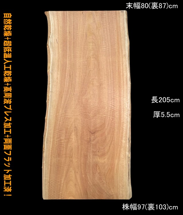 ◆全国都道府県 送料無料◆ 紅椨 極上 無垢 一枚板 寸法:長205cm× 末幅80cm(裏87cm) ~ 中間幅90cm(裏95cm) ~ 株幅97cm(裏103cm)× 厚5.5cm 約69kg この板の良い所 素晴らしい! 全面総縮杢! しかも紅椨! こんな板早々ありませんよ~ 地方によれば椨桜とも呼びますね。 見事な杢で圧倒されます。 色はオレンジから薄いピンク色で、縮の感じも柔らかくて優しい縮杢なので、 いやらしさもなく本当に美しいです。 ここ迄くればこの板なら資産となりますので、不要になれば下取りOKだから! 欠点無しの激レアな一枚だ!! この板のちょっと悪い所 無し!! ☆出荷前に再度両面最終仕上げのフラット加工後、梱包出荷いたします ☆ 厚みも2mm~5mm程度削るため薄くなることなどはご了承下さい。 (フラット加工が不要は方はご指示下さい。) ◎北海道、沖縄県を含むすべての都道府県で送料無料です。 但し離島の場合や、配送業者の規定により送料が別途必要となる場合があります。 ・法人屋号や、個人様でも〇〇商店や〇〇ショップなど、屋号のある場合はお知らせください。(看板や店名が分かる表示をお願いします。) ・送料無料の範囲はすべて軒先降ろしまたは配送車両横付付近の敷地10歩以内迄となります。 ・室内への開梱設置が必要な場合はオプションで別途費用が必要となりますのでお問合せ下さい。 ・弊社より発送後、お客様地域の配送業者の規定によりご自宅まで配送ができない場合があります。 その場合は最寄りの営業所止めとなります。もしくはご希望の住所への配送の場合は別途費用が発生します。 板屋市場 兵庫県西脇市谷町419 Mobile:080-7437-7154 Mail:[email protected] 機械を動かしているので、気が付かないこともありますが、折り返し連絡いたします。 ご購入予定の一枚板をご覧になりたい方は、事前にご予約をお願いたします。 また必ず板の品番・樹種をお知らせ下さい。 (不定休で留守の時もありますのでよろしくお願いします。)
