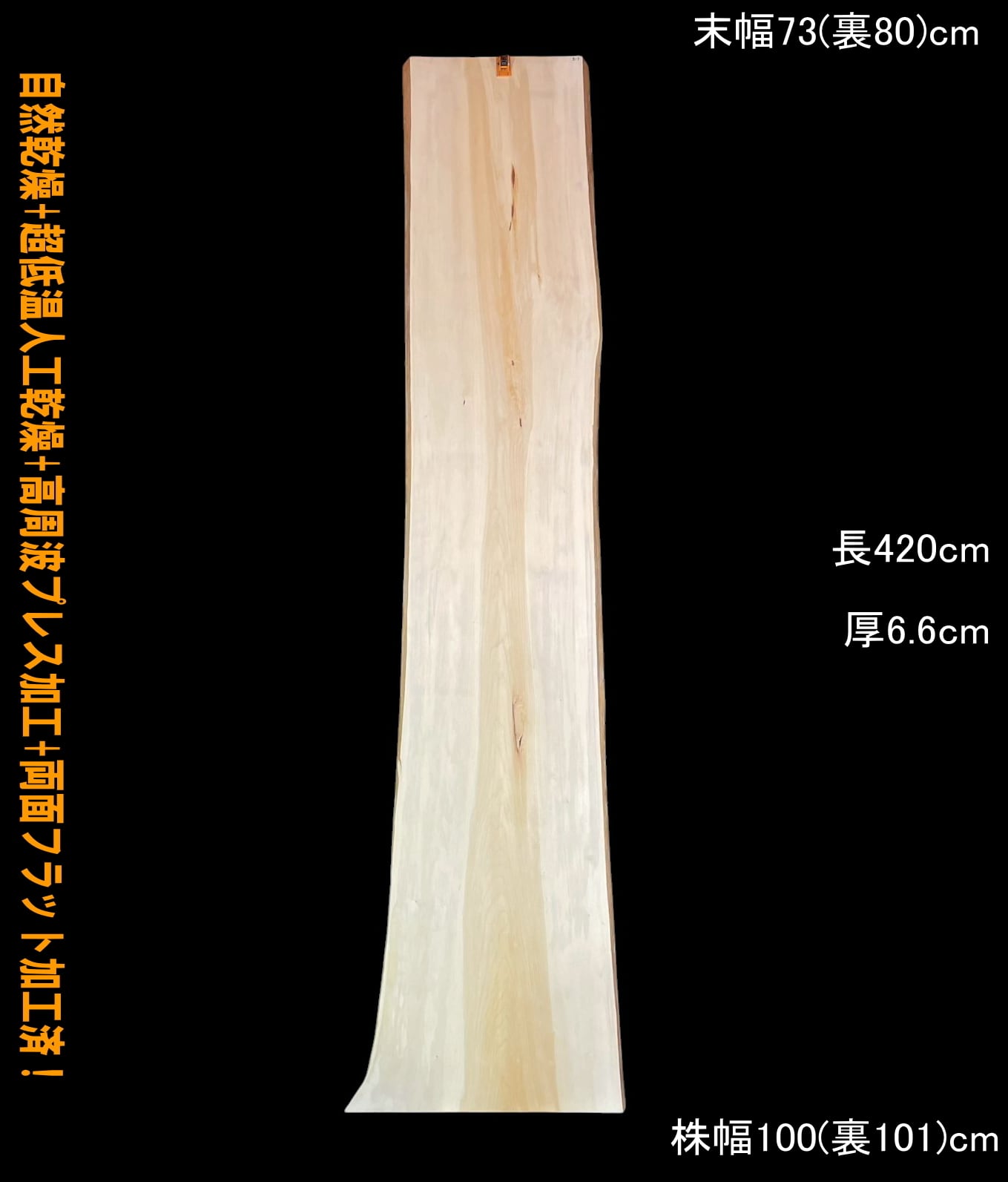 寸法:長420cm× 末幅73cm(裏80cm) ~ 中間幅74cm(裏79cm) ~ 株幅100cm(裏101cm)× 厚6.6cm 約97kg