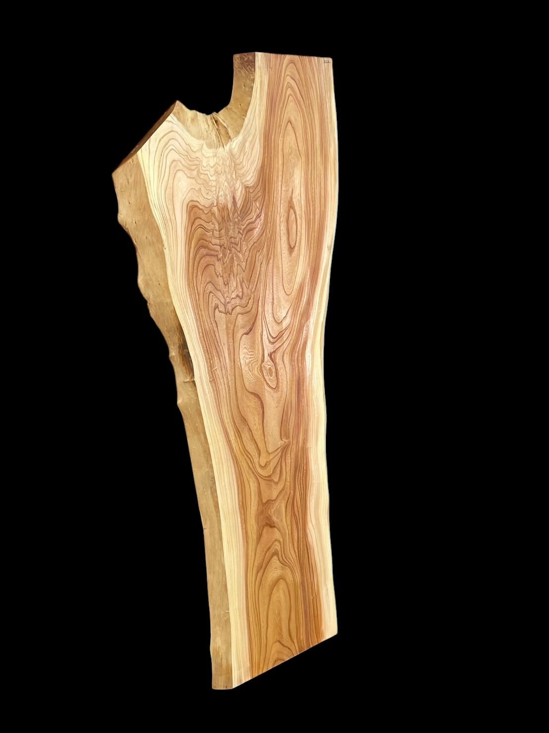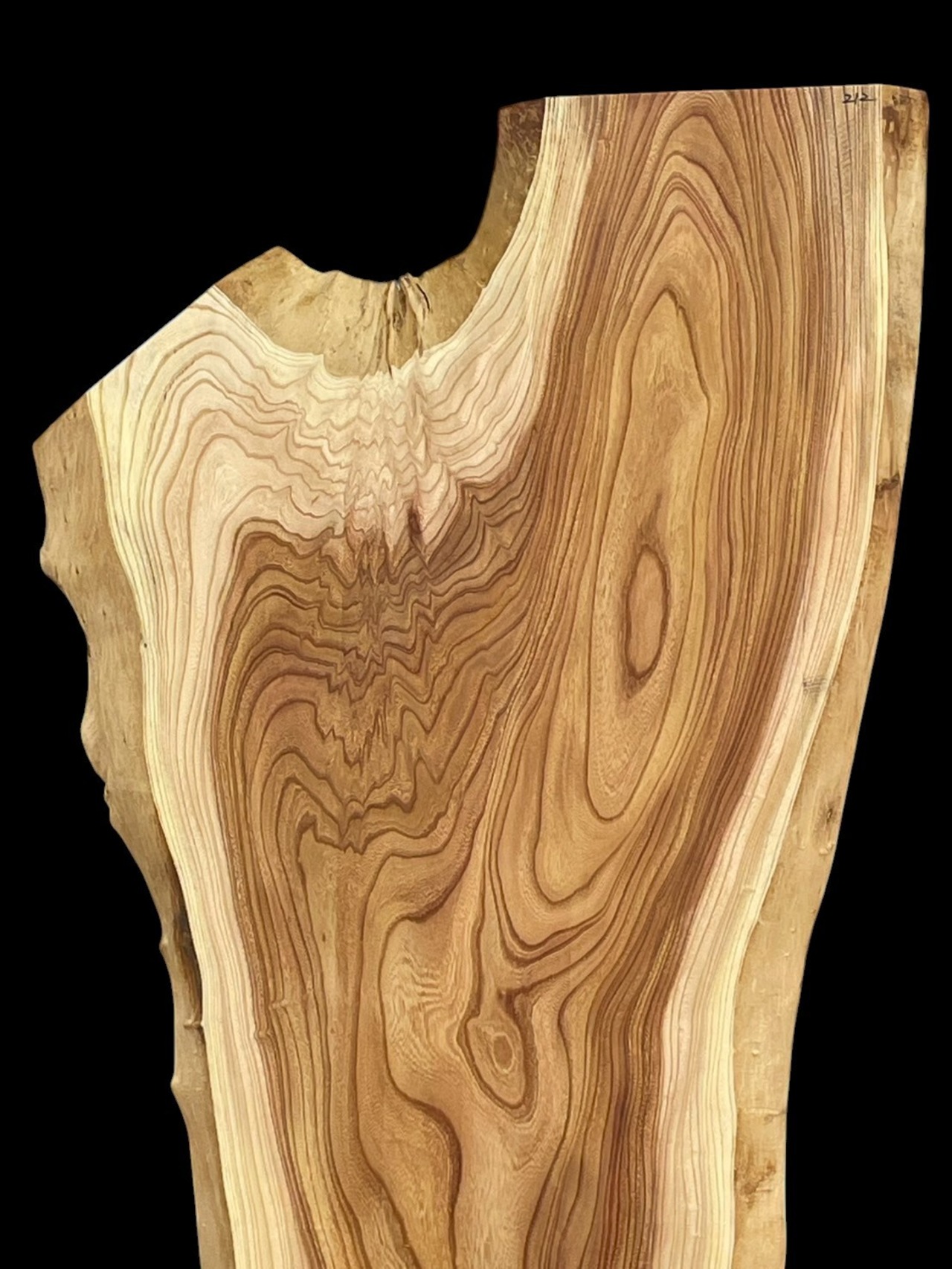 このサバ杢は、大きな幹から枝が二股に別れる部分に見られる杢で、
