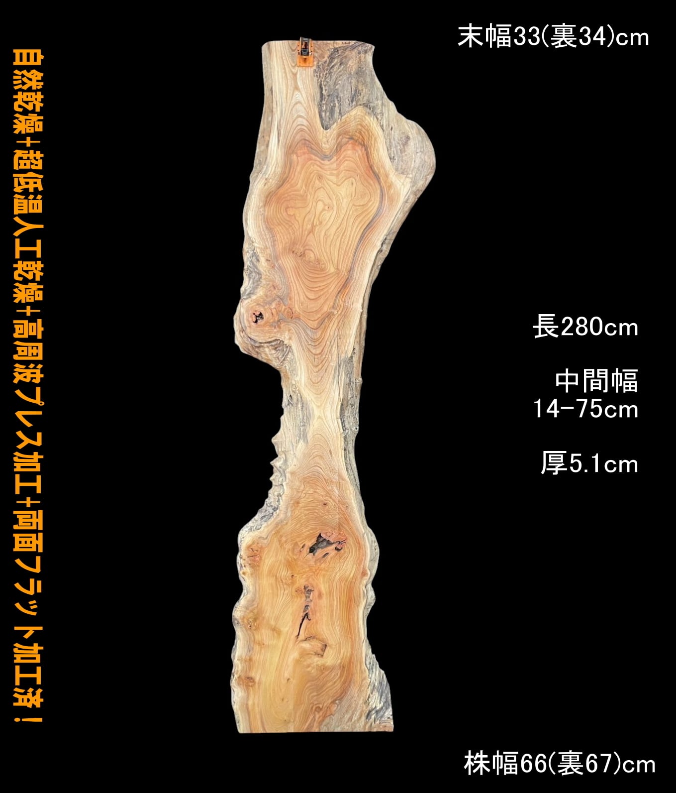 寸法:長280cm× 末幅33cm(裏34cm) ~中間幅14-75cm ~ 株幅66cm(裏67cm)× 厚5.1cm 約50kg