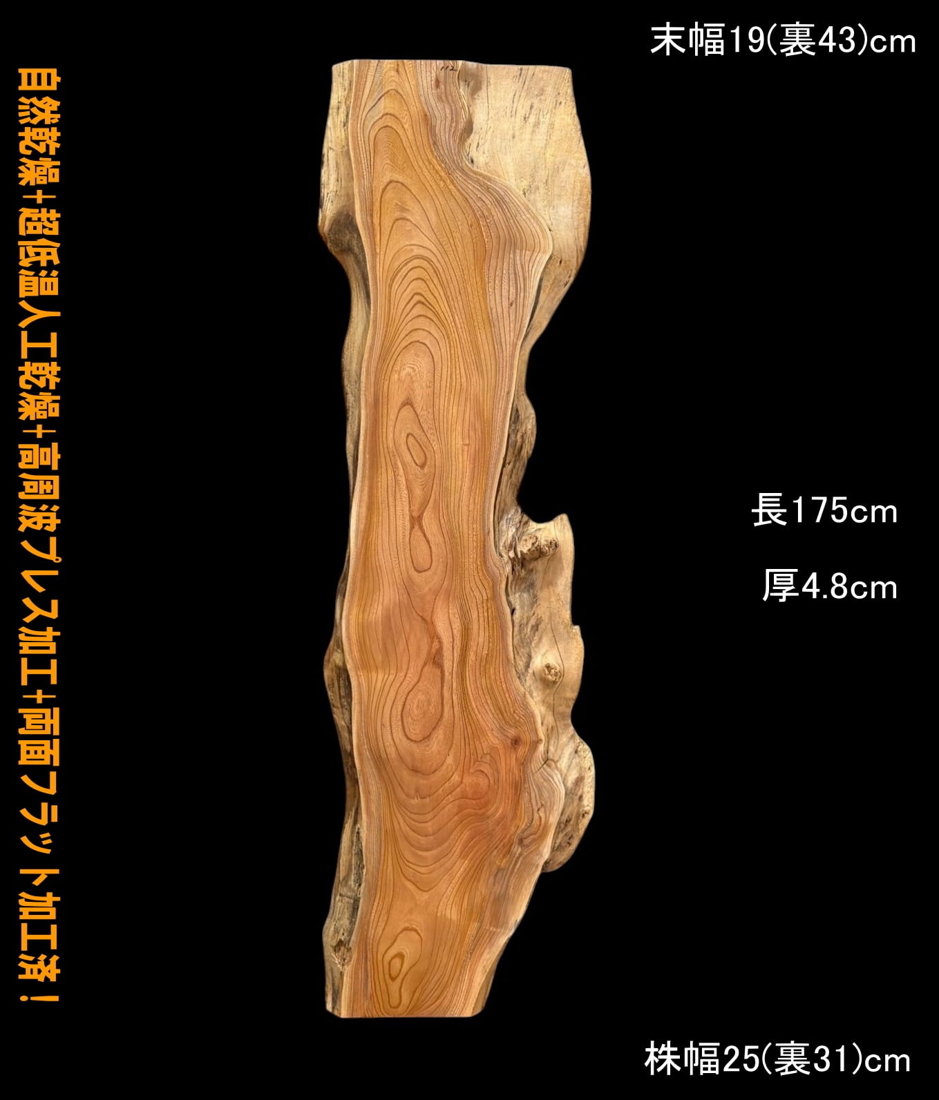 寸法:長175cm× 末幅19cm(裏43cm) ~ 中間幅26-48cm ~ 株幅25cm(裏31cm) × 厚4.8cm 約20kg