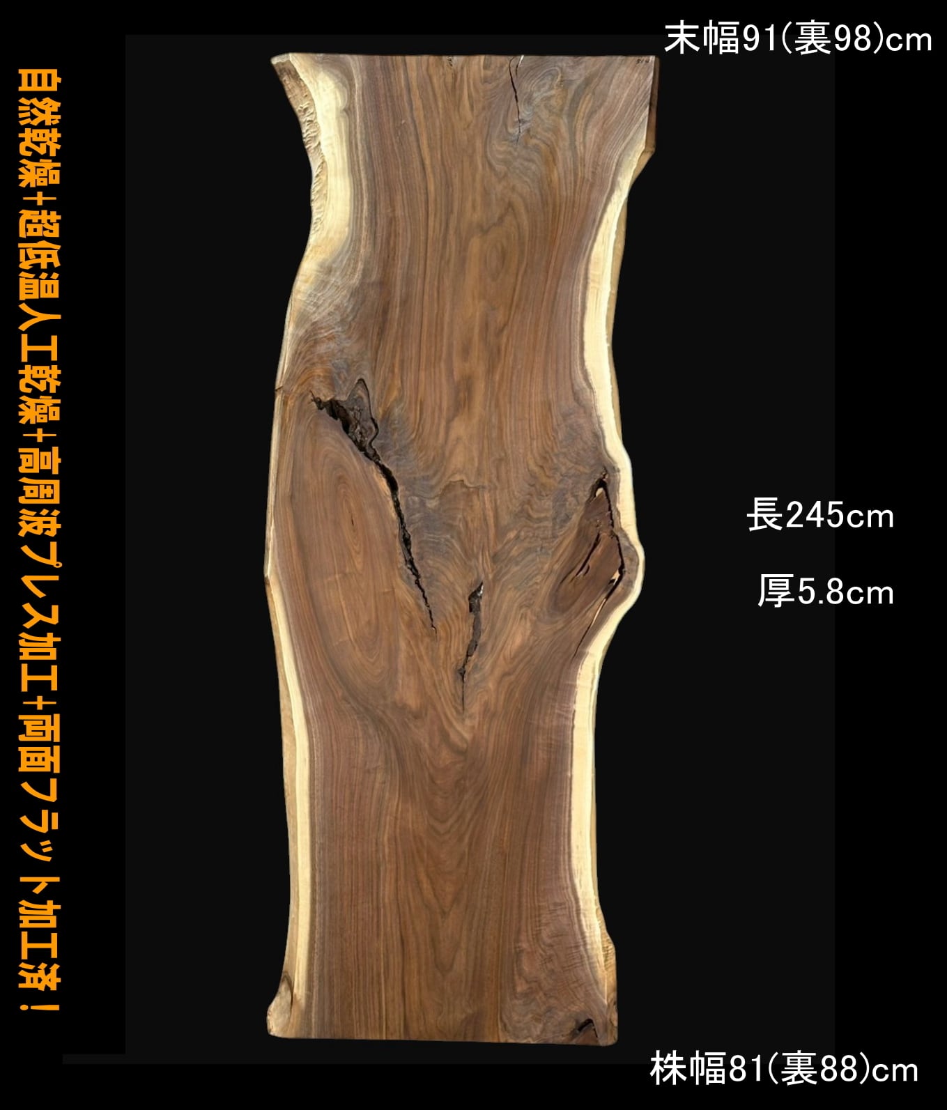 寸法:245cm × 末幅91cm(裏98cm) ~ 中間幅74-95cm ~ 株幅81cm(裏88cm) × 厚5.8cm 約72kg